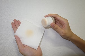 ティッシュなどに何度かたたき、パフにパウダーの色がつくまでなじませる